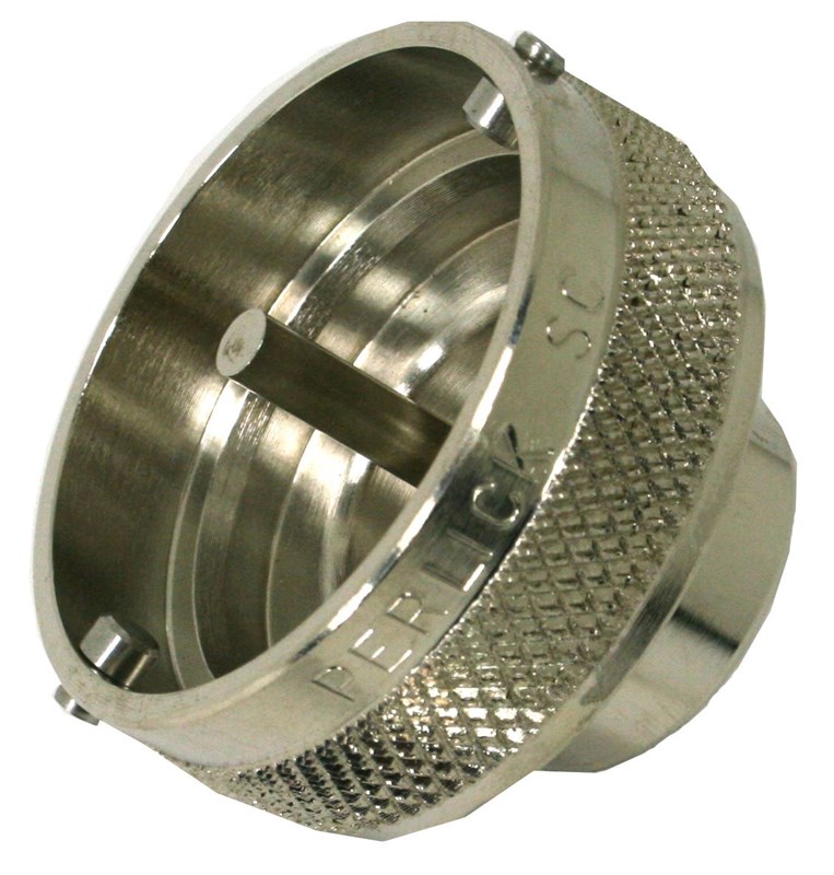 Perlick's keg coupler is in the untapped (handle up) position, allowing the