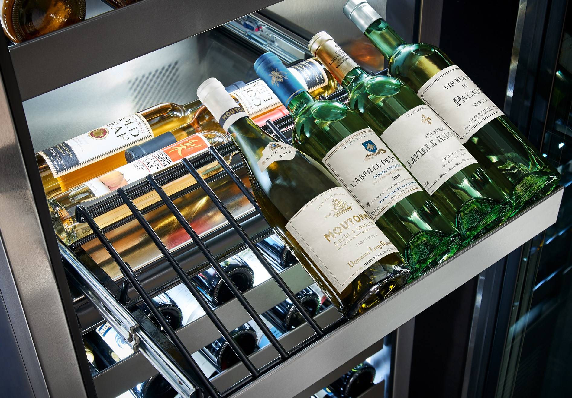 - Heavy-duty, full-extension, soft-closing wine shelves; Shelves are black polymer dipped to provide vibration protection and protect labels from abrasion