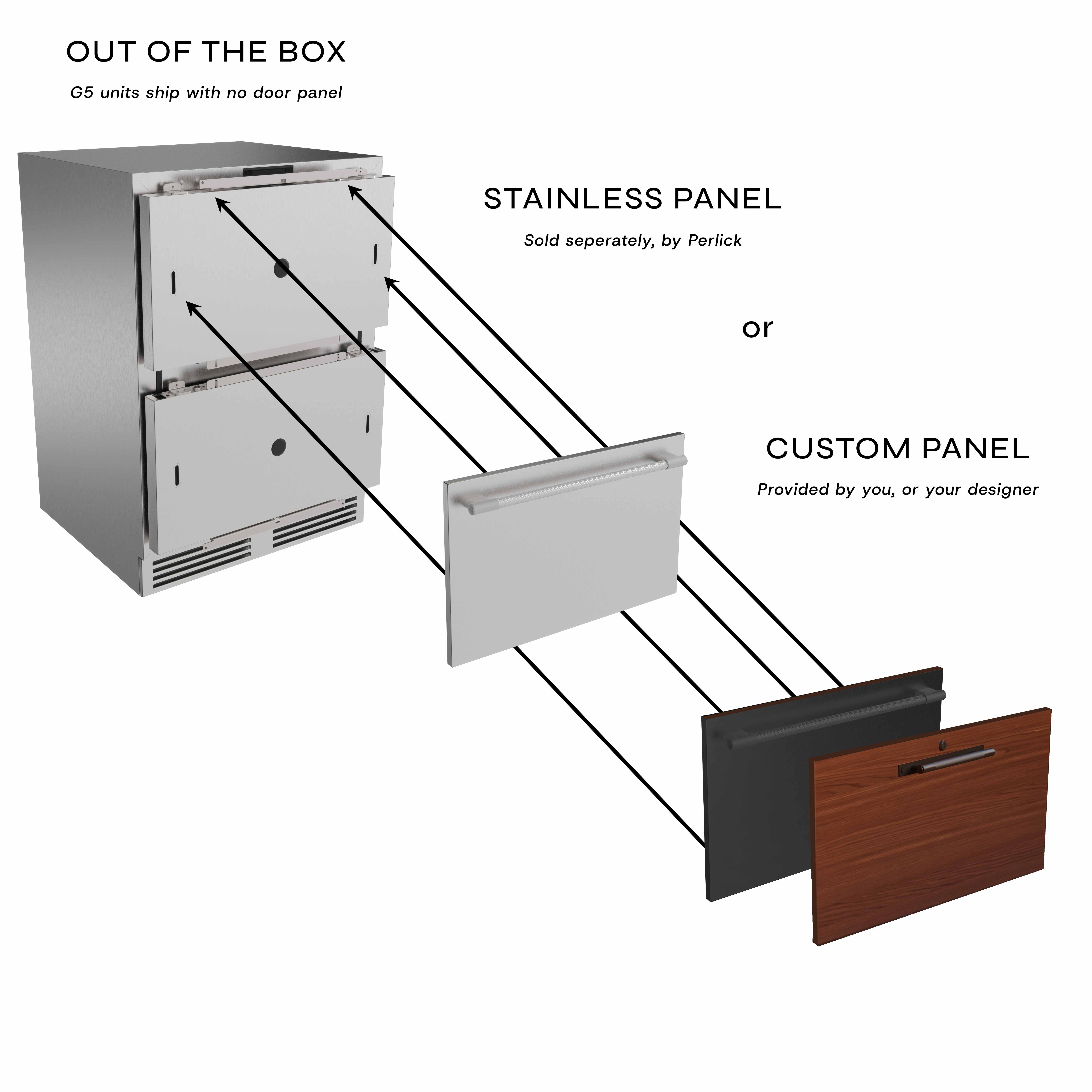 G5 units come panel-ready for full design customization, accommodating either custom millwork panels or Perlick stainless-steel panels for a seamless built-in look.