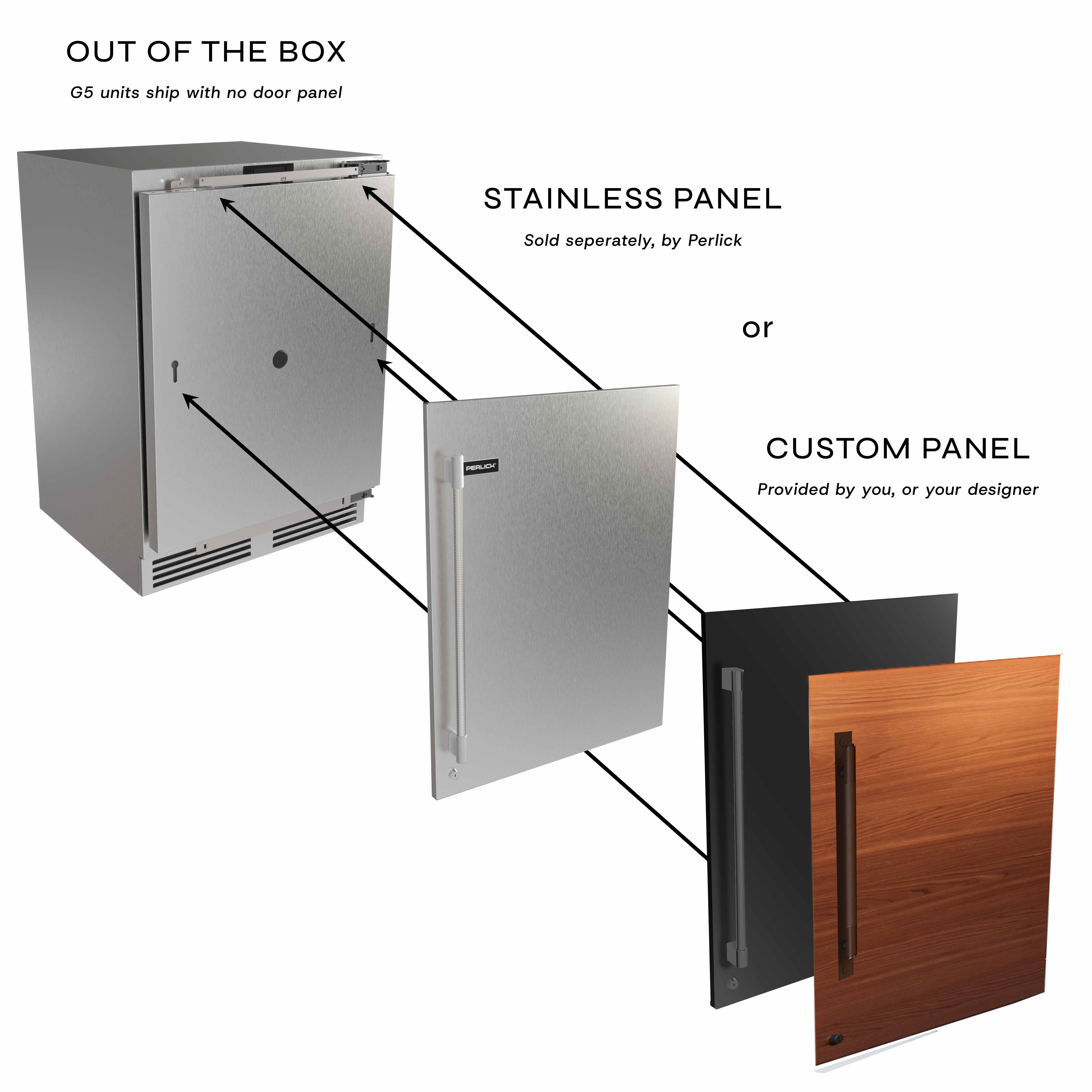 G5 units come panel-ready for full design customization, accommodating either custom millwork panels or Perlick stainless-steel panels for a seamless built-in look.