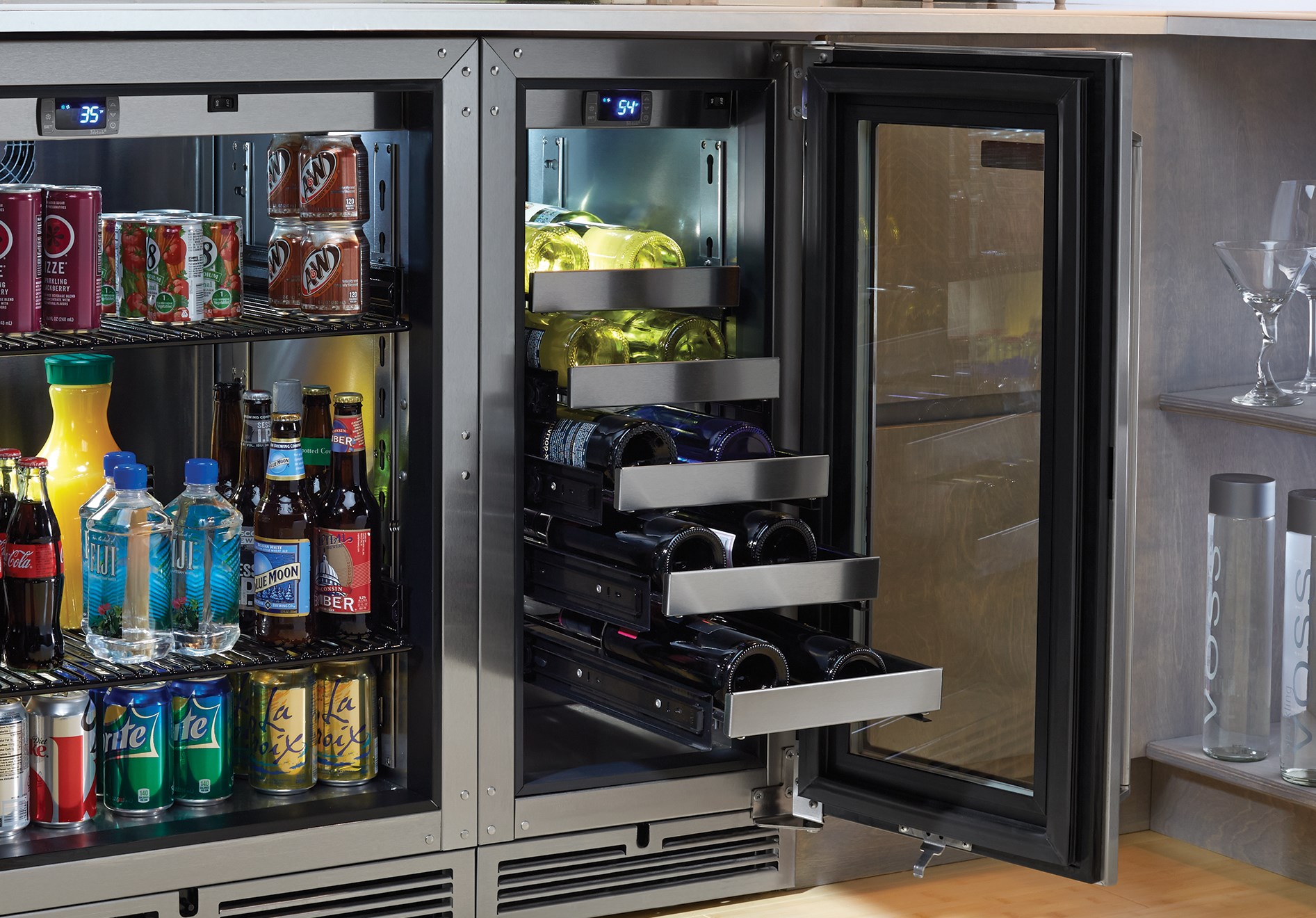 - Wine shelves fully extend on vibration dampened, stainless steel ball-bearing glides; stainless steel wine shelves will not absorb odors over time. Full extension shelving provides faster and safer product access with no reaching in the back of the cabinet