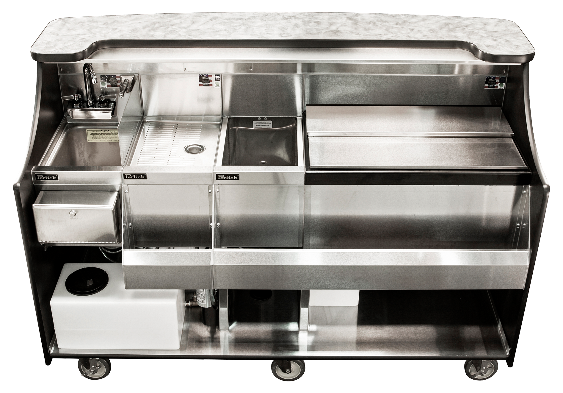 66" Top Shelf Mobile Bar with handsink, Drainboard, Ice Chest, Bottle well. Now you can take the party anywhere. Perlick’s mobile bars are an economical solution to ensure patrons and staff are safely socially distanced.