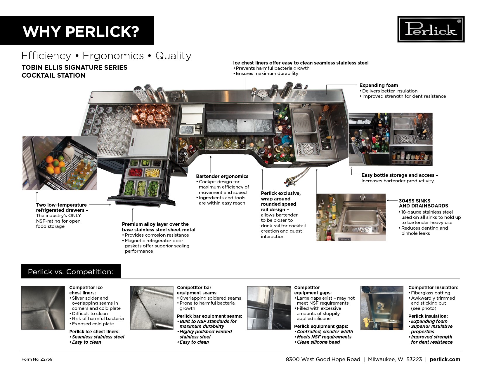 - Perlick exclusive, rounded speed rail design allows bartender to be closer to their work counter and guests.