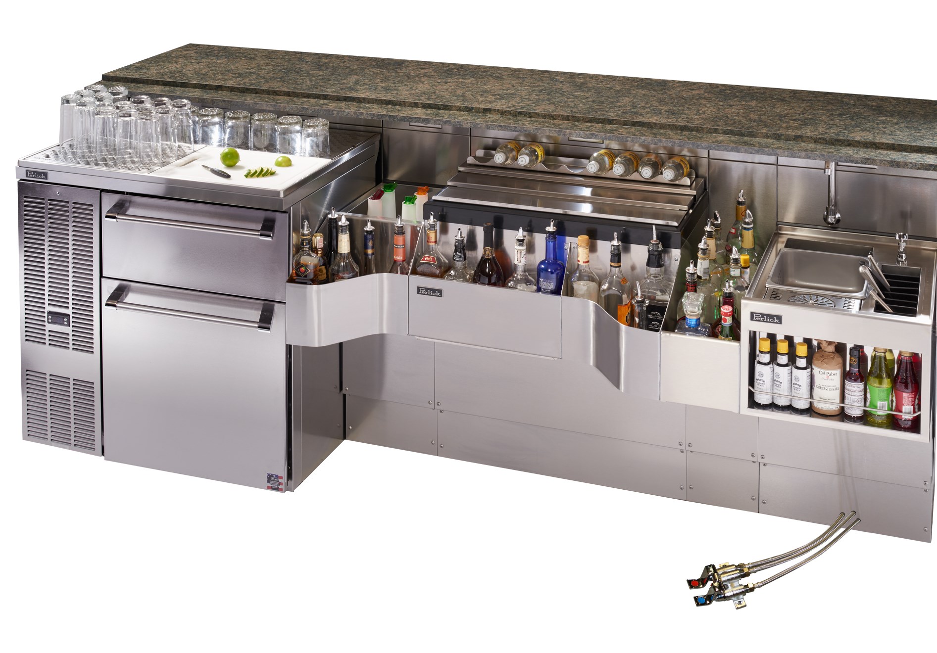 80" wide, Full depth bottle well, 2nd bottle well with soda manifold housing, ice chest, liquor step, prep sink with foot pedal operated faucet. Featuring the Tobin Ellis zero-step bartending cockpit design that increases efficiency, maximizes drink throughput, and ensures bartender comfort.