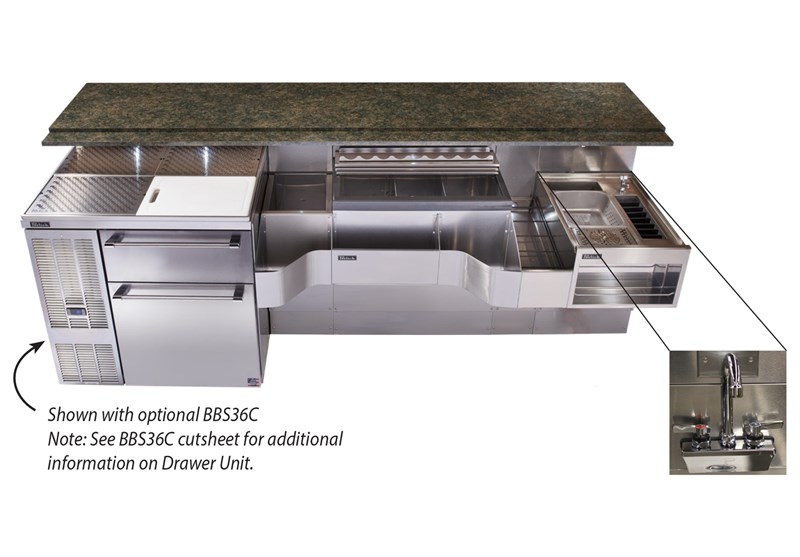 - Prep Sink and Tool Caddy consisting of main sink with integrated glass-rinser, sectional health code compliant tool caddy, foot operated faucet, optional built in cubby for additional storage