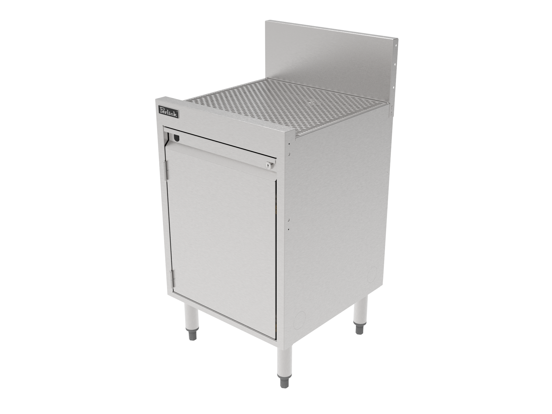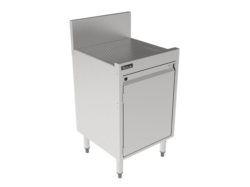 Storage cabinet with pitched drainboard top and adjustable intermediate shelf. Storage Cabinets serve a variety of unique bar environment needs and maximize vertical storage space for all of those items that need to be out of the way but easily accessible.