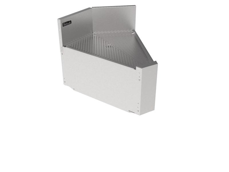 TS Series Underbar Inside Corner Drainboard, 45° angle clipped rear corner, backsplash, 1-1/2" drain, all stainless steel construction, Perlick Quick Clamp tool less leg attachment, optional legs, typically mounts to adjacent equipment.