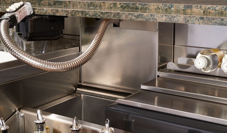 Keep wine, beer, champagne, juice or syrups at arm's reach without cross contamination into serviceable ice. Shallow depth model allows room for optional soda gun manifold locker.