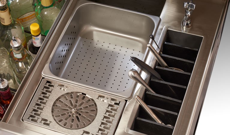 - Integrated tool caddy accommodates various length bar tools and Includes a dedicated faucet.