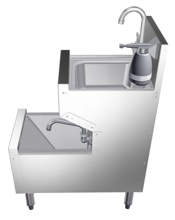- Two faucet design allows for traditional hand sink operation while foot pedals operate dump sink faucet for easy cleaning of shaker tins.