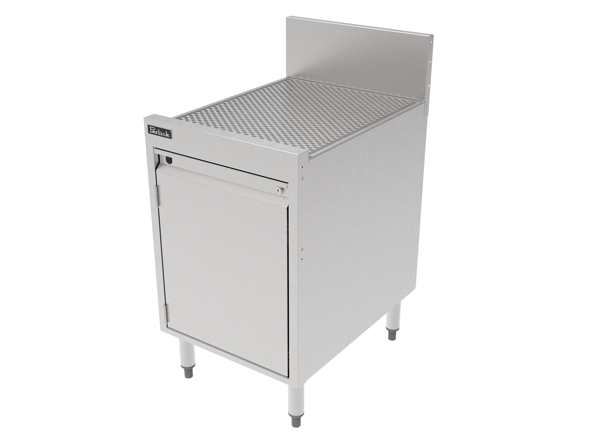 Storage cabinet with pitched drainboard top and adjustable intermediate shelf. Storage Cabinets serve a variety of unique bar environment needs and maximize vertical storage space for all of those items that need to be out of the way but easily accessible.