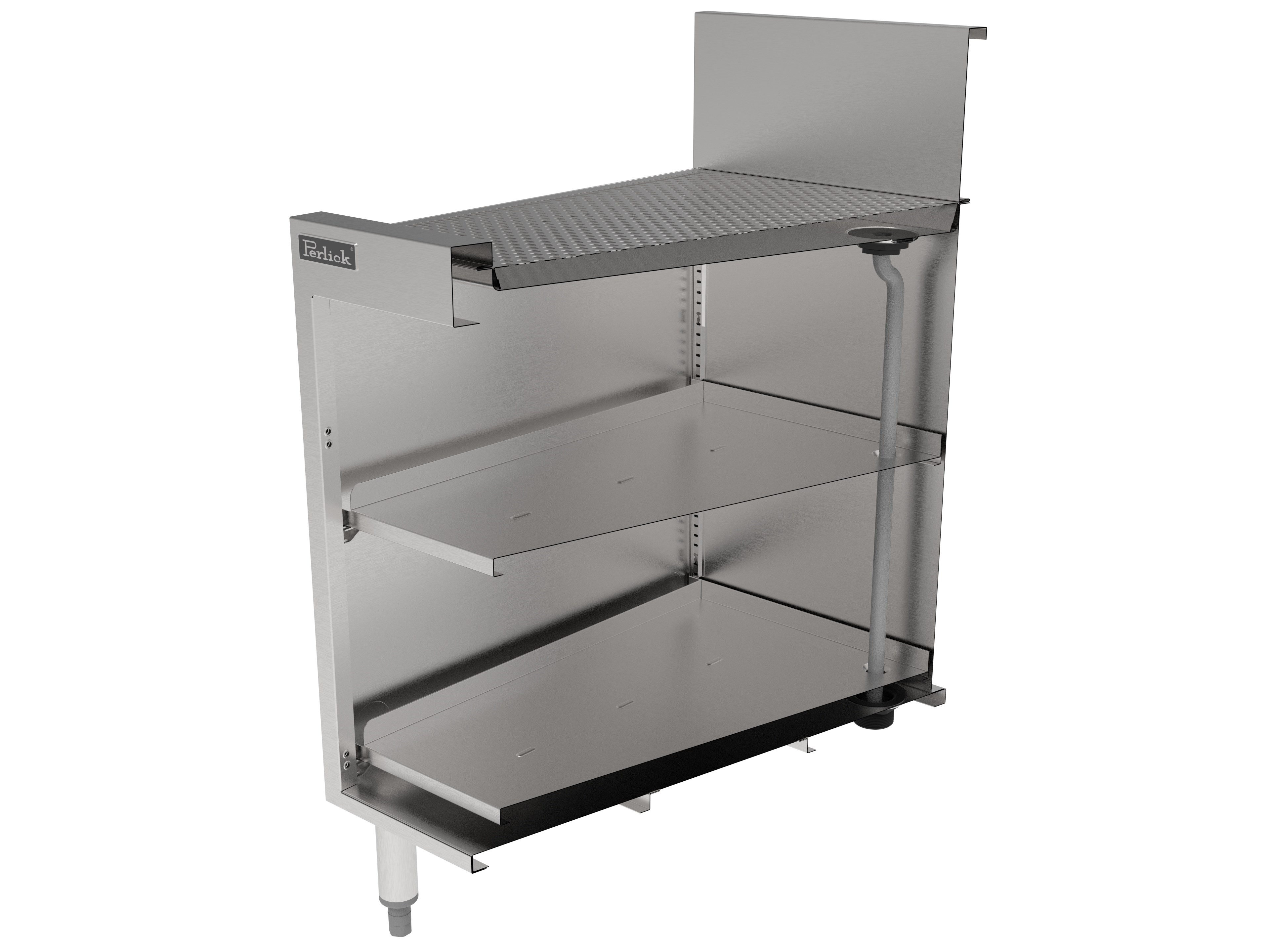 - Drainboard tops and glass rack shelves are pitched to the drain so water is evacuated quickly and effectively, with the matching insert you still get a flat, level space to store your glassware.