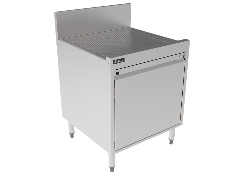 Storage cabinet with pitched drainboard top and adjustable intermediate shelf. Storage Cabinets serve a variety of unique bar environment needs and maximize vertical storage space for all of those items that need to be out of the way but easily accessible.