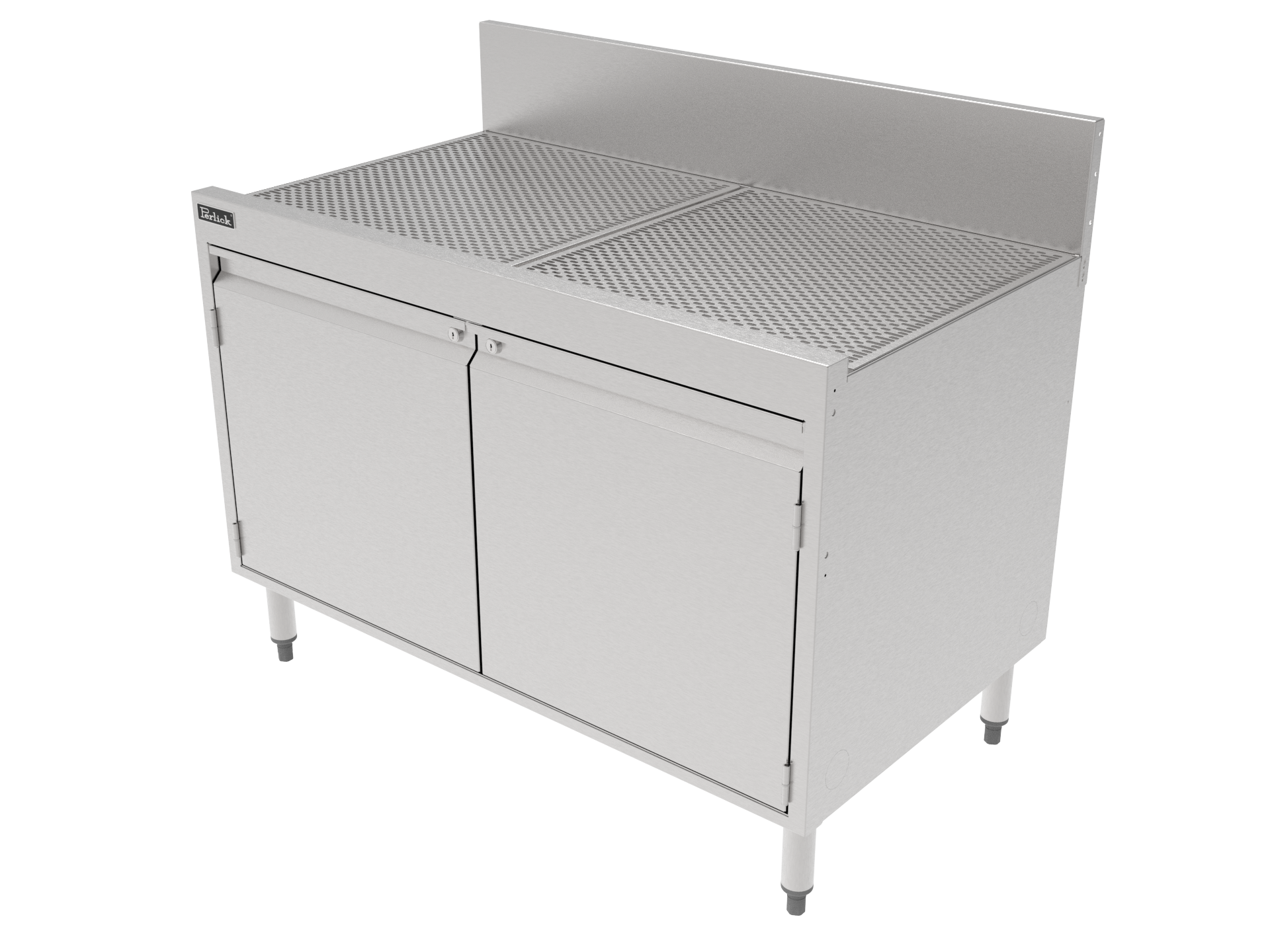 Storage cabinet with pitched drainboard top and adjustable intermediate shelve. Storage Cabinets serve a variety of unique bar environment needs and maximize vertical storage space for all of those items that need to be out of the way but easily accessible.